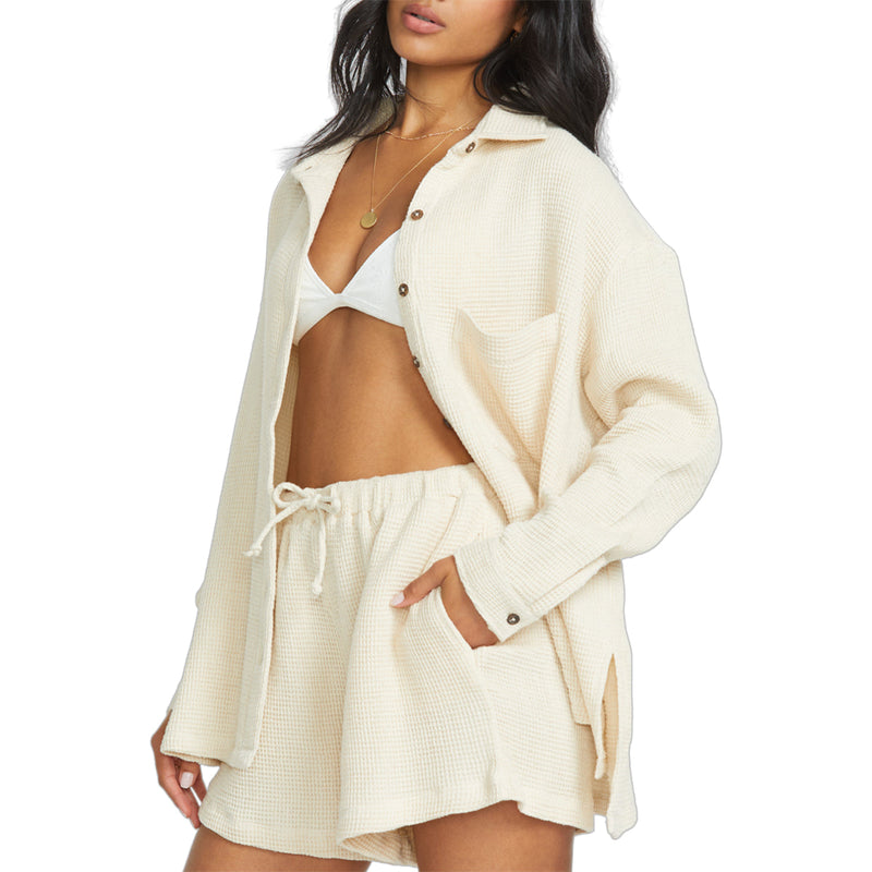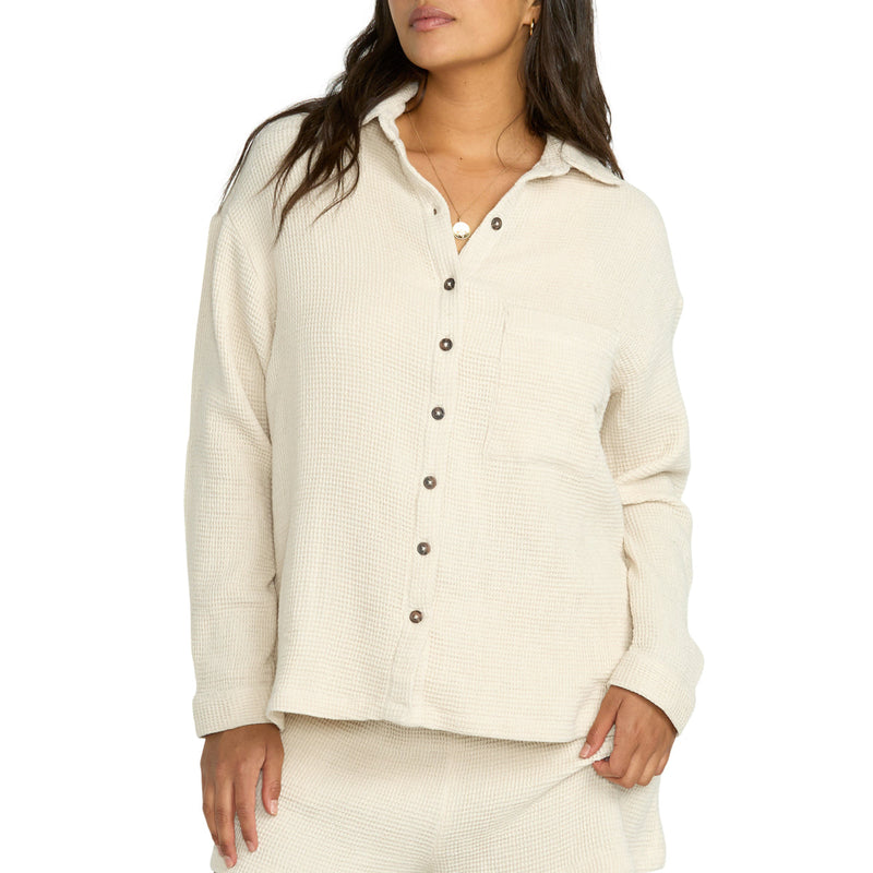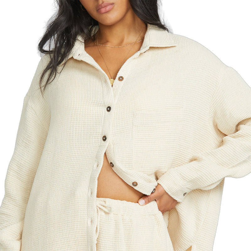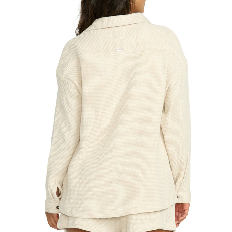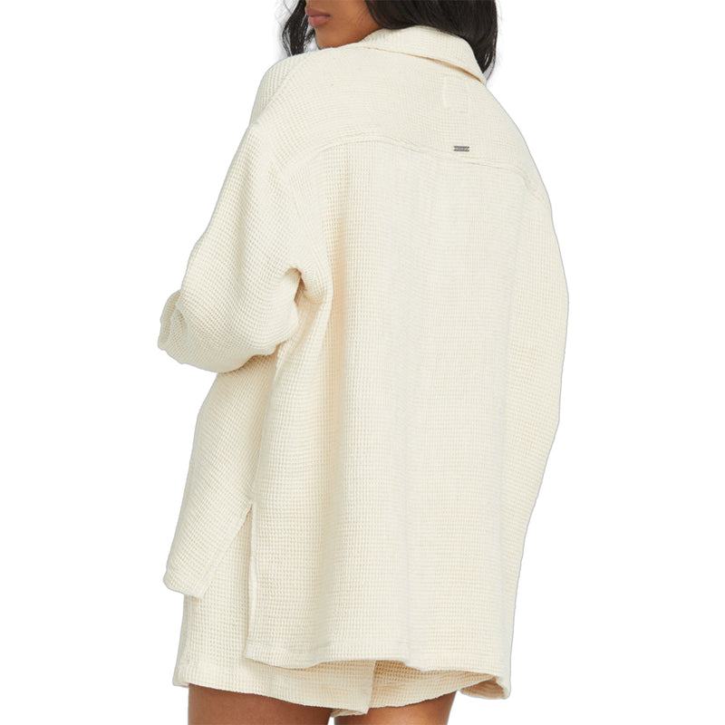 Cozy up in this stylish 100% cotton blend Billabong Women's So Cozy Shacket Jacket. Oversized with long sleeves, patch pocket, and button-front, it's the perfect transitional layering piece.