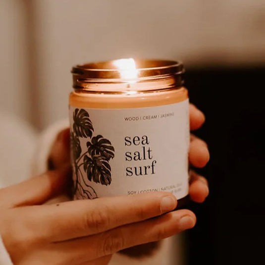 Strolling along the beach on a crisp morning, sea salt kissing the wind. Flowery jasmine followed by sweet cream blends with beachy driftwood create this fresh, yet alluring Broken Top Sea Salt Surf Soy Candle - 4 oz. scent.