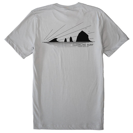 The Cleanline Haystack Rays T-Shirt features the gem of the north coast of Oregon, Haystack Rock in Cannon Beach. Represent the original Pacific Northwest surf shop everywhere you go. Artwork designed by local talent, Dallas Pattie.