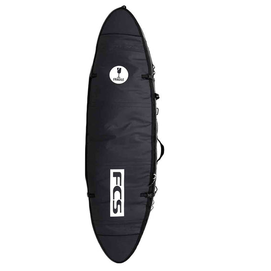 The FCS Travel 1 Funboard Cover Travel Surfboard Bag is designed for single board travel, featuring a lightweight construction with 10mm dual density padding through the body, added 5mm high density nose protection, heavy duty nylon skin, padded rail protection, an expandable fin wing for boards with or without fins, an ergonomic vented shoulder pad, and durable marine grade PK Delrin zippers built for long term performance.