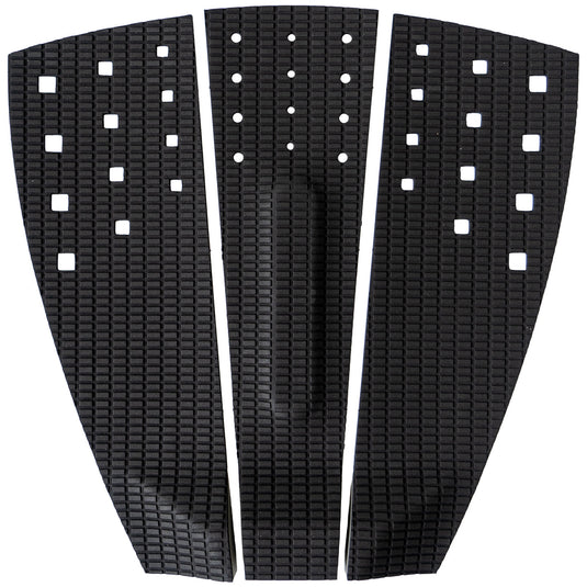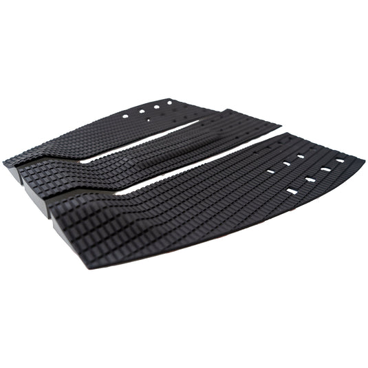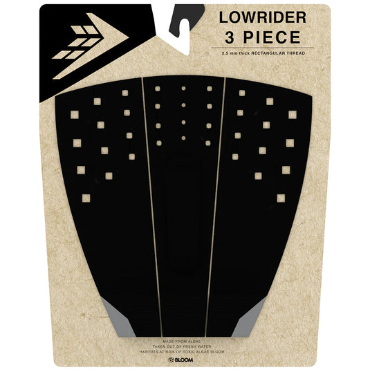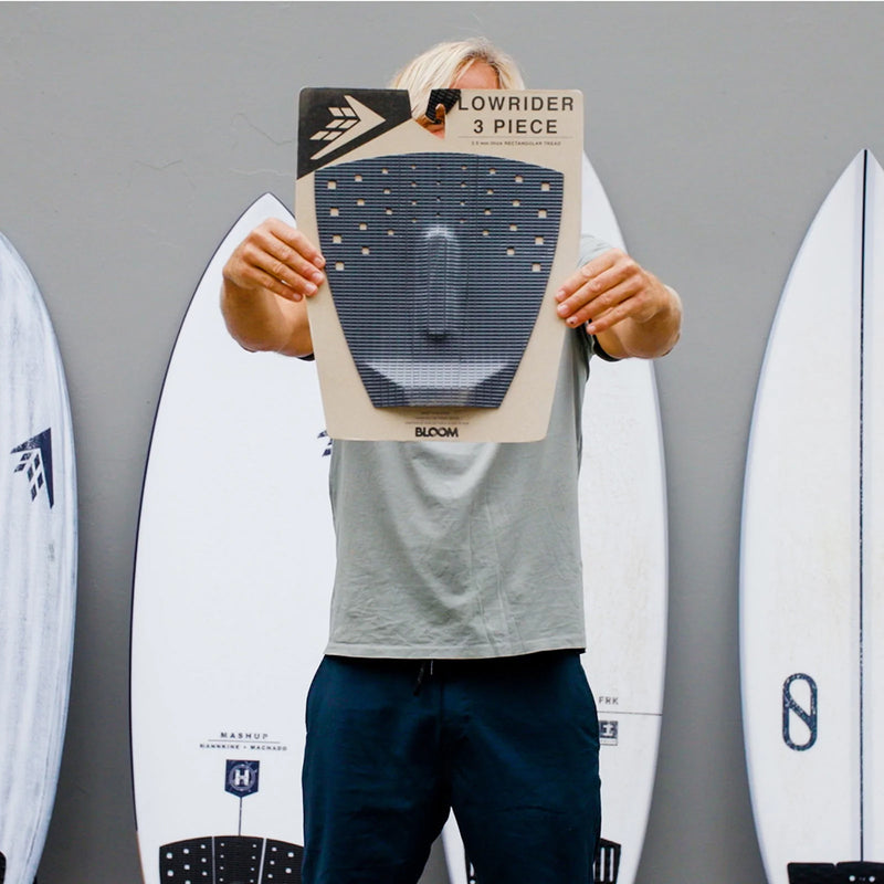 Thin for board feel. Subtle and simple in design. The Firewire Lowrider 3-Piece Traction Pad was created for maximum sensitivity between your foot and the deck of your surfboard, enabling grip and control on any surfboard. This pad provides a more natural feeling when compared to larger tread patterns with its thin rectangular grooves, and has a low incline tail kick trimmed at the heel and toe edge of either side of the pad. It has just enough elevated surface area behind your back foot to enable turns as tight as you can drive them with an extra firm arch bar, creating one of their favorite eco-friendly traction pads yet.