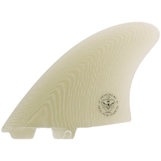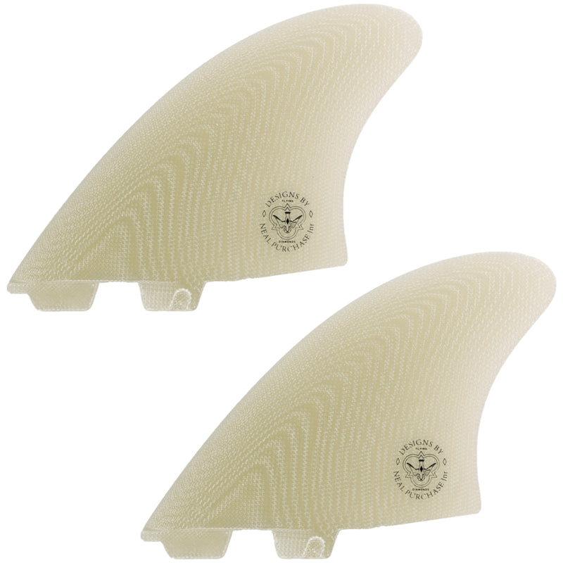 This is a Flying Diamonds keel fin set with some much needed Neal Purchase Jr. performance upgrades. Built with foiling for speed and outline for solid turns, particularly on the backside. Works great with wider twinnies for down the line performance, enhanced hold in more critical surf, and improved turning manners.