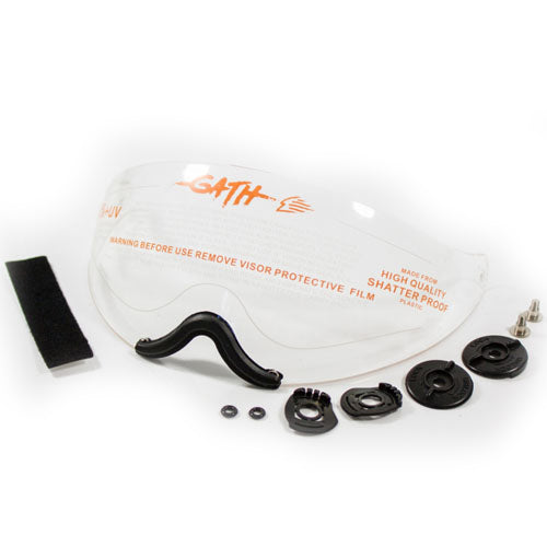 Adding a Gath Gedi Half-Face Visor to your Gath Gedi convertible helmet provides additional sun and spray protection. The see-through visor installs on the Gedi’s visor threaded inserts, includes ratcheting visor mount and can be worn up, down, or at several positions in between.