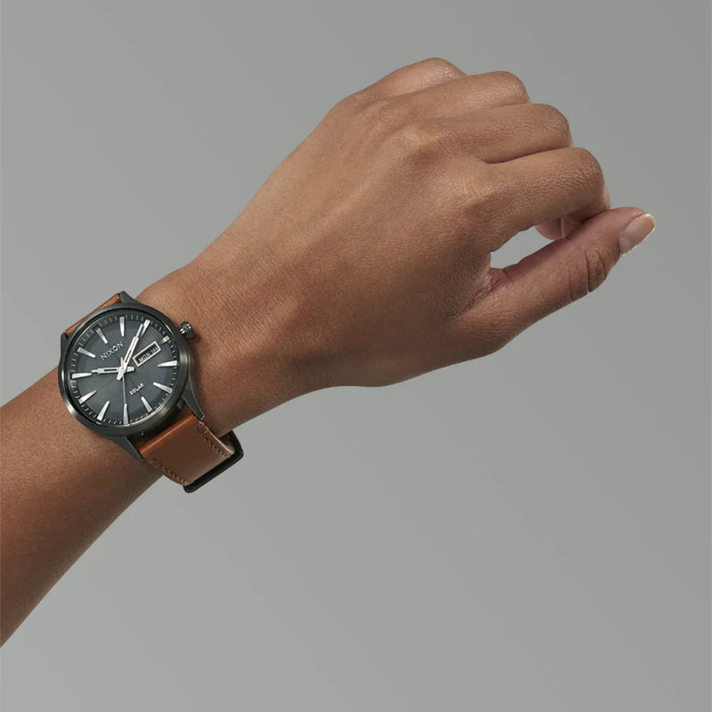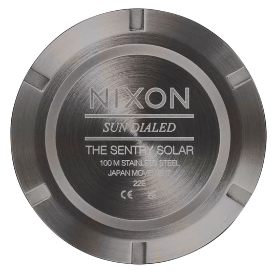 Making our best model better, Sentry has gone Solar. Nixon's classic “thin black tie meets block party” timepiece just got an upgrade with limitless potential. Now equipped with a solar cell and Lum tip skeleton hands. Wear it for one hour under office lights to power an entire day, or expose it to six hours of direct sunlight to store six months of charge! Tap into a piece of Nixon heritage with Sentry Solar, now engineered for a brighter tomorrow.