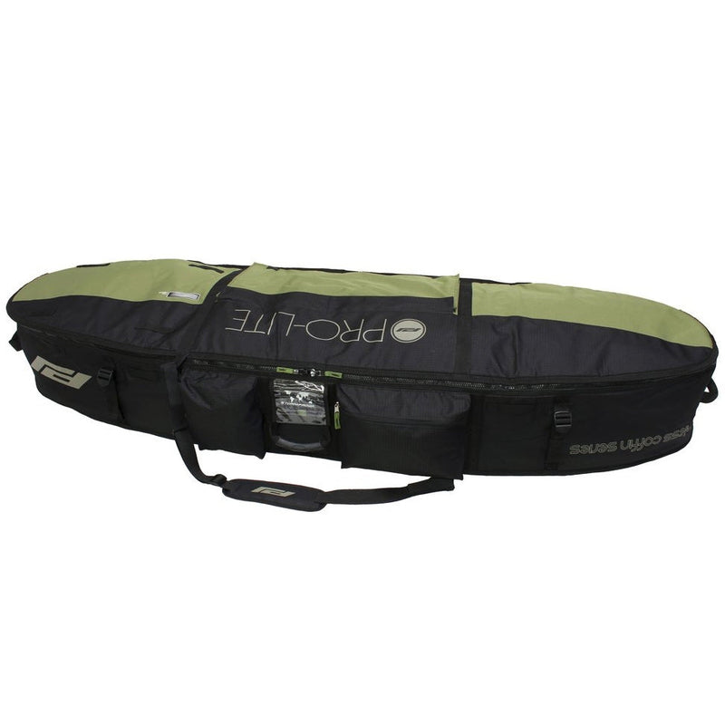 Planning on packing the shortboard, step-up and uh oh watch out, the mini-gun? Well if you're charging that hard you’re definitely going to need a bag that can handle your quiver. The Pro-Lite Finless Coffin Triple Travel Surfboard Bag can pretty much handle anything you can dish out. With 10mm foam protection to give you more cushion when the baggage attendant be pushin'. Large exterior pockets with drainage will keep the crust off your boardshorts and the smile on your face. An internal divider and a board packer bag provide the perfect separation for your boards. Need a place for your stash? Throw it in the secret pull out "storage" pocket. Don’t worry about salted zips on this bag; super beefcake molded non-corrosive zippers will keep the movement smooth for the life of the bag.