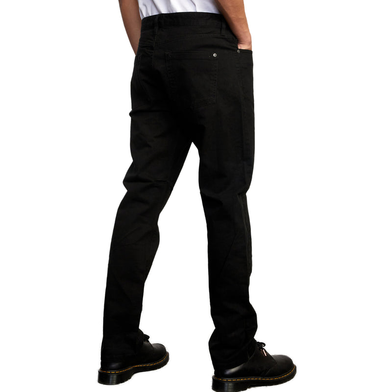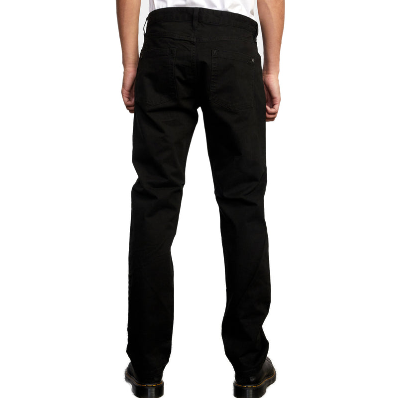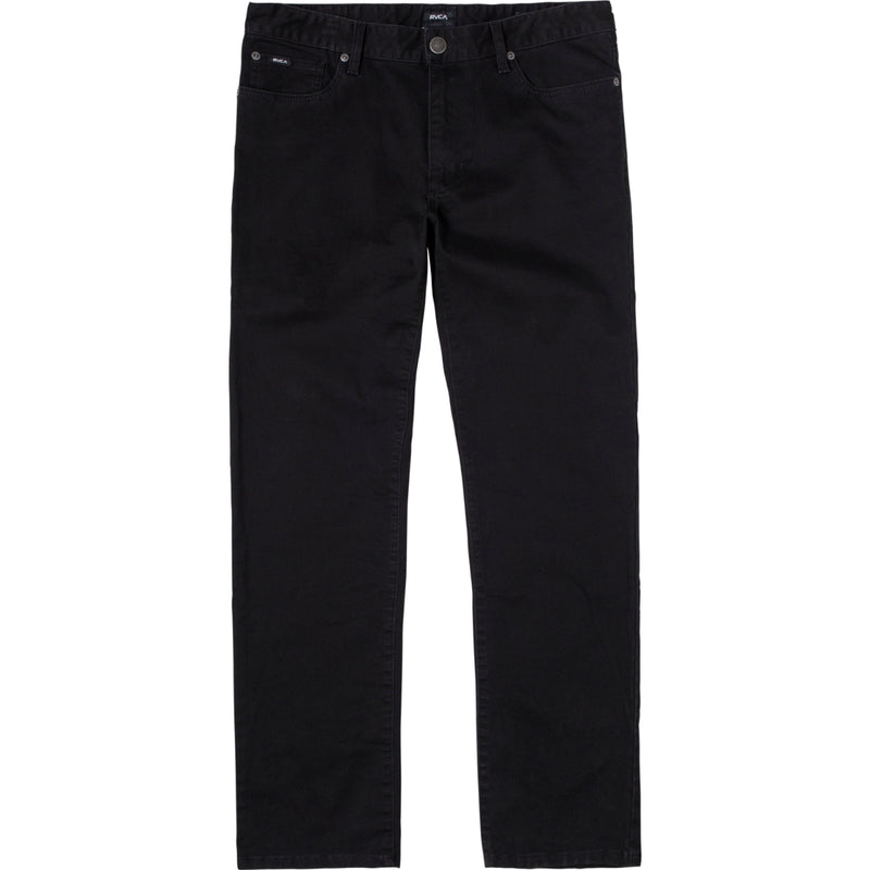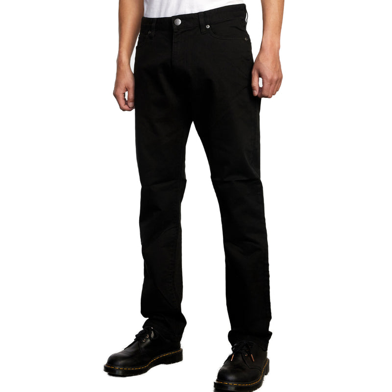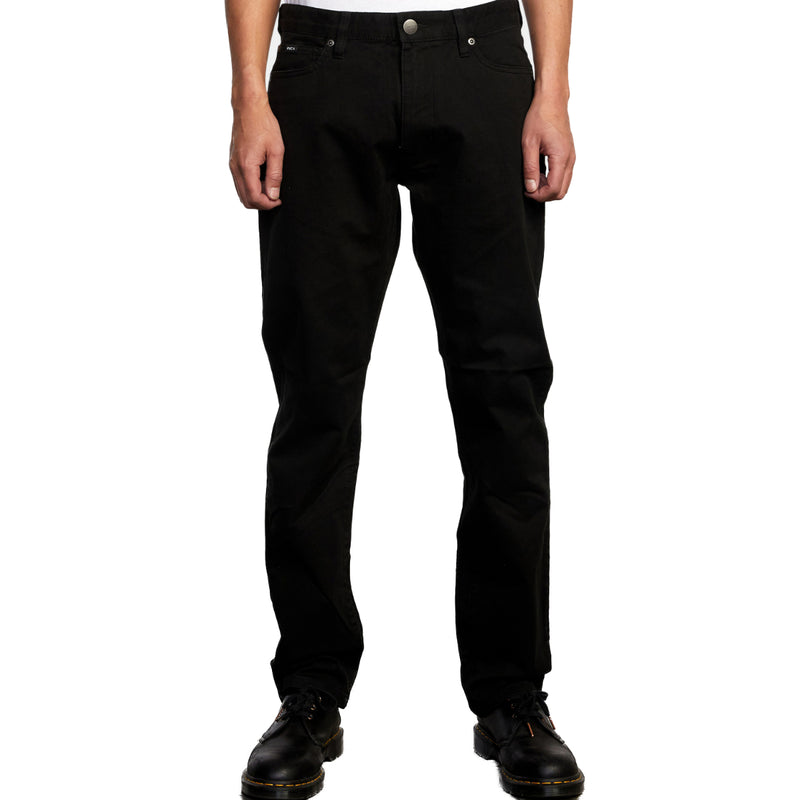 The RVCA slim fit twill pants offer easy style and comfort in one. Featuring a slim fit, these men's pants are made from cotton twill with stretch for ultimate flex throughout. Built with a zip fly closure, front RVCA shank button, 5-pocket styling and RVCA logo branding throughout.