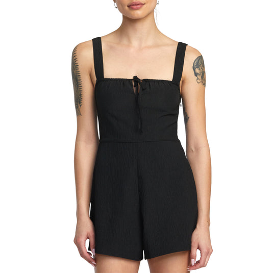 Experience effortless style with the RVCA Women's Mayfair Romper Onesie. Crafted in a soft and lightweight fabric, this tank romper features a straight neck, sleeveless design with a tie at the neckline and a smocked back to perfectly hug your shape.