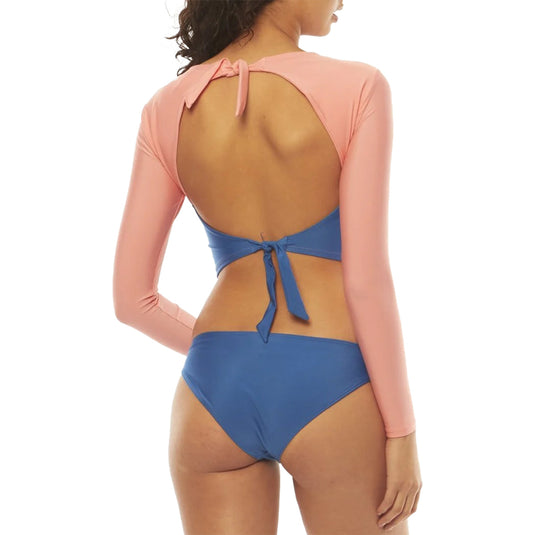 The Sisstrevolution Women's Solid Beach Crush Long Sleeve Rash Guard disregards convention with its bold exposed back design. An essential addition to your beachwear collection, this long-sleeved rash guard features a stylish color block design with back waist and neck tie details for a comfortable and secure fit. Made from 100% recycled Repreve fabric.