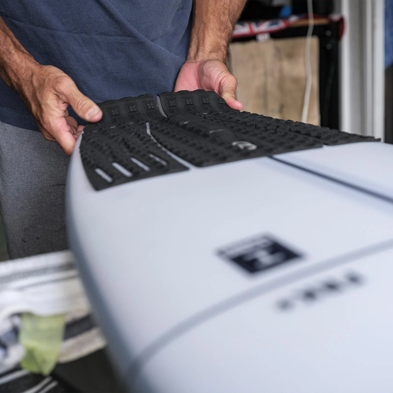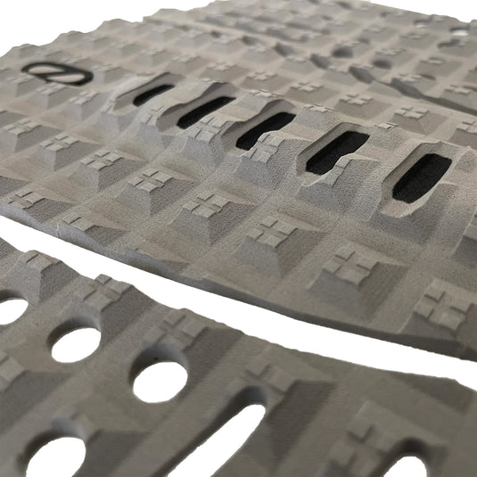 Kelly's newest approach to back foot traction. The 11x World Champion asked for an additional ‘cutaway’ on the arch, and all of you on Instagram asked for an arch pad with square tread. Their answer is the Slater Designs 3-Piece Arch Traction Pad, with cutaway sections in the back third of the pad placed for turning tight off the bottom. Circular and parallel cutaways in the first two thirds have been placed for pumping with your foot further forward.