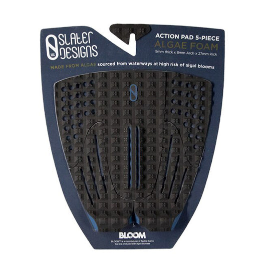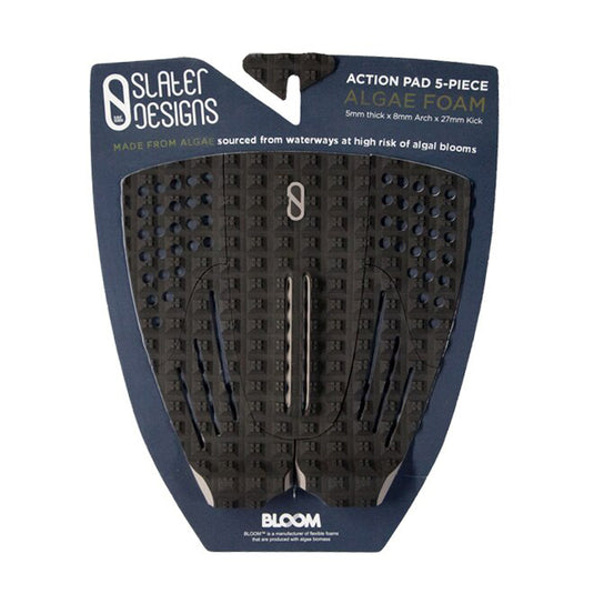 Kelly's pad of choice (and named after his dog). The Slater Designs 5 Piece Action Traction Pad is Kelly’s favorite arch, with functional design from Kelly directly. He chopped a ‘ V ‘ into the tail kick to prevent your leash from catching and slit the arch. The arch support is just as wide as on the 3 and 5 piece Slater Designs pads, but lower on this one. The square grooved edges on either side of the parallel slits give you a ‘hooked in’ feeling that other arch supports won’t, and the Action Pad also gives you options: a longer pad or a shorter pad, depending on how you chose to space the the side pieces from each other.