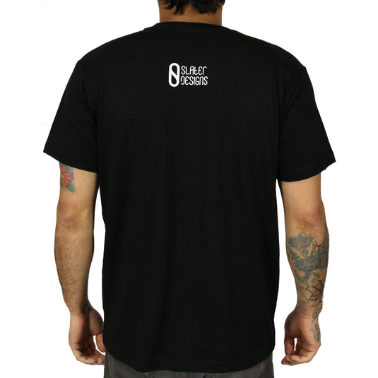 The Slater Designs Backside T-Shirt is a premium soft organic cotton short sleeve tee with a regular fit, printed with the Slater Designs pill logo on the front and back. Made In The USA.