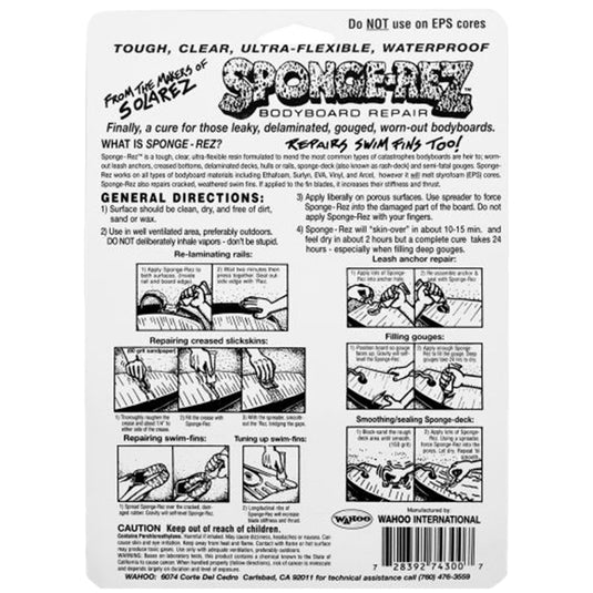 Solarez Sponge-Rez Bodyboard Ding Repair is a tough, clear, flexible resin formulated to mend the most common types of catastrophes bodyboards are heir to; worn-out leash anchors, creased bottoms, delaminated decks, hulls or rails, sponge-deck (also known as rash-deck) and semi-fatal gouges. Sponge-Rez works on all types of bodyboard materials including Ethafoam, Surlyn, EVA, Vinyl, and Arcel, however it will melt styrofoam (EPS) cores. Sponge-Rez also repairs cracked, weathered swim fins. If applied to the fin blades, it increases their stiffness and thrust.