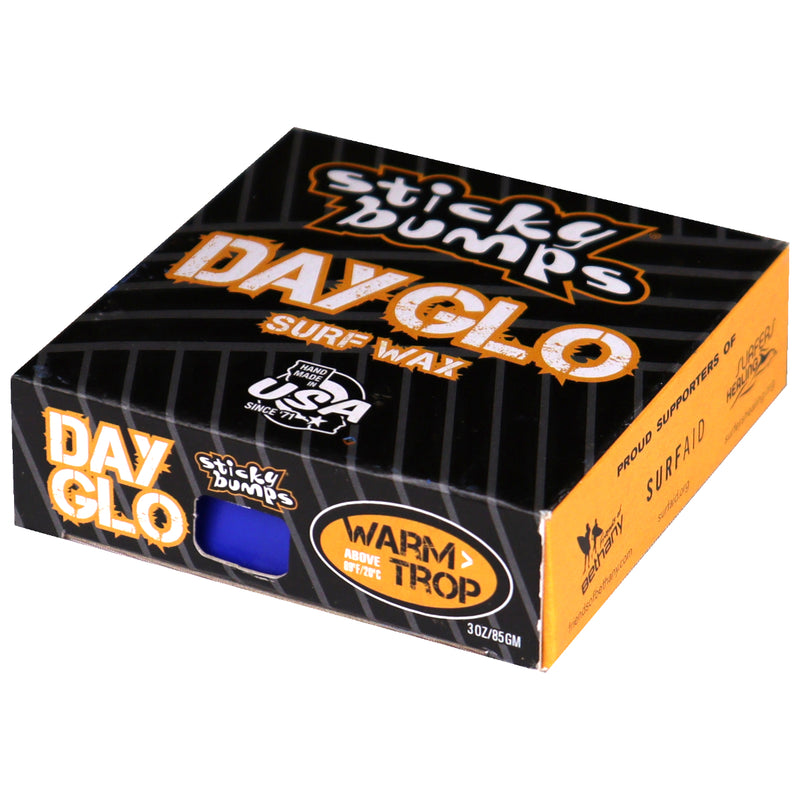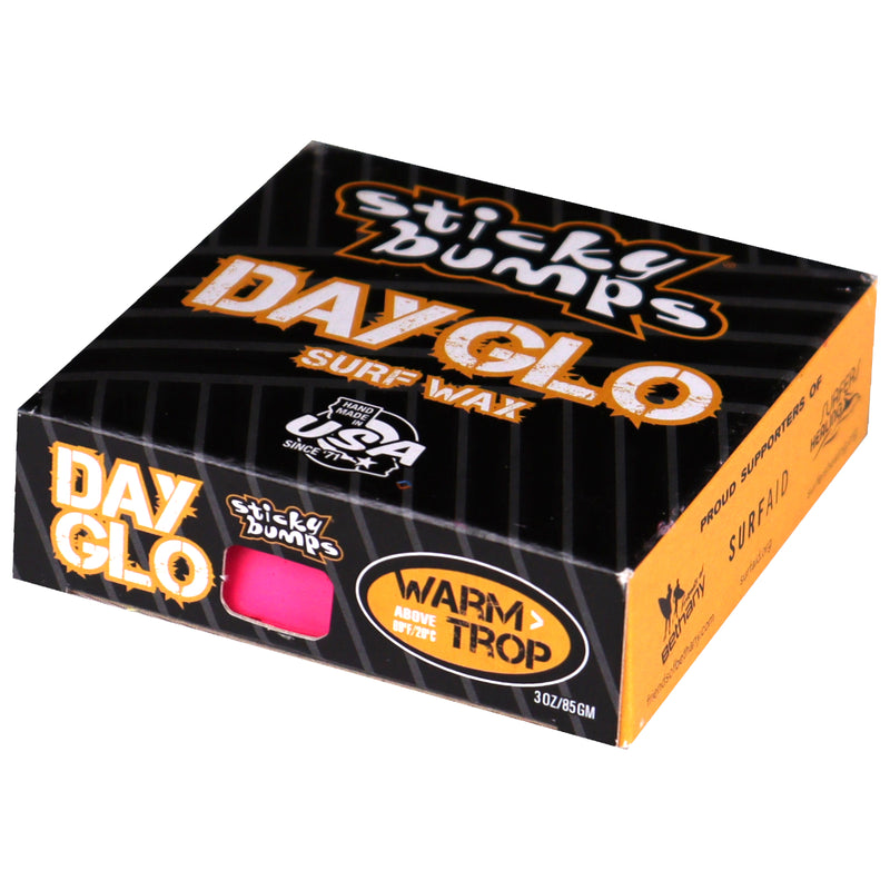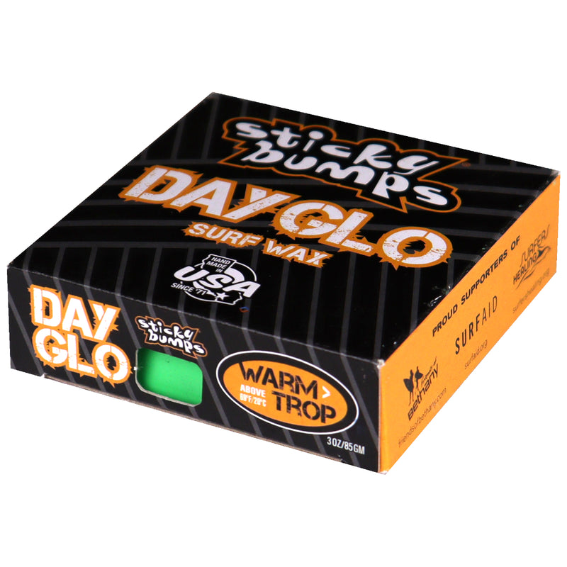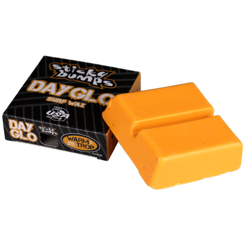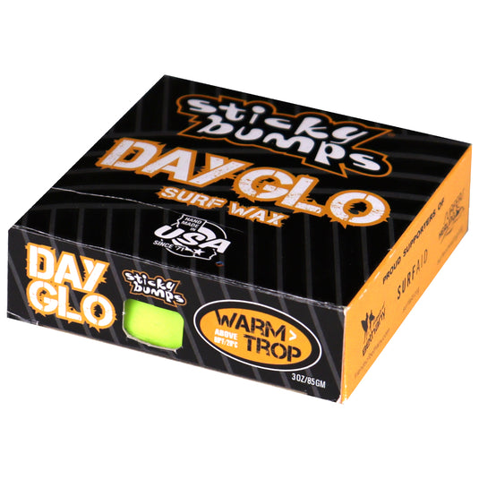 Use Sticky Bumps Day-Glo Wax to highlight your landing zone, write a message or make a waxterpiece (wax masterpiece). With blue, green, yellow, orange, red and pink options, there are plenty of colors that will liven up your day in the water. Using the Sticky Bumps Original formula, the Day-Glo Warm/Tropical Wax is perfect for dependable hold in warmer water conditions and will deliver its best performance when use with a Sticky Bumps Basecoat underneath for more stability and resilience. These high quality, handcrafted bars are created in Sticky Bumps no waste California factory, with everything possible being reused and recycled. Instantly recognized and well loved, Sticky Bumps Wax snags, grabs and builds up the perfect sticky bumps for your riding pleasure.