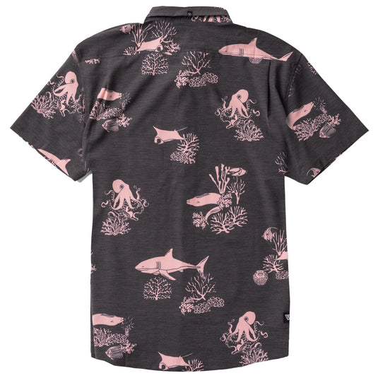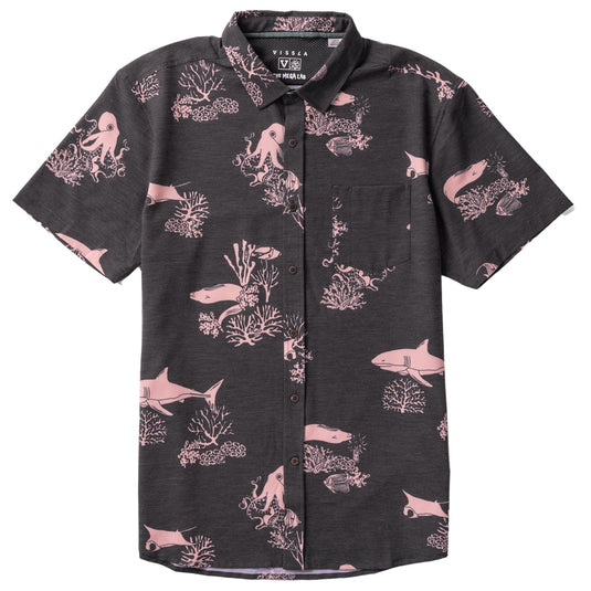 Vissla's Mega Lab Hybrid Eco Short Sleeve Button-Up Shirt is an excellent choice for wet or dry conditions. Styling includes a sewn in center front placket, front chest pocket, unique all over print, and contrast chambray lining at inside back yoke. Garment washed with enzyme + softener.
