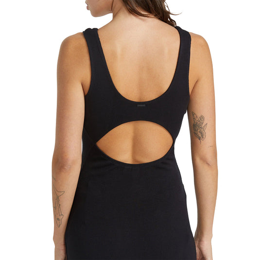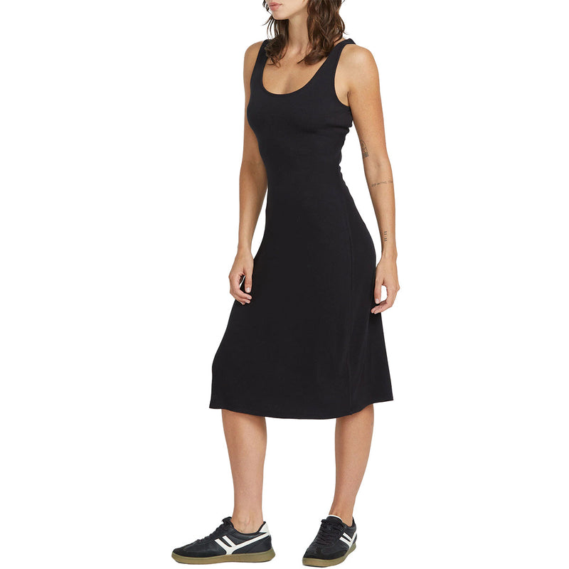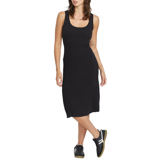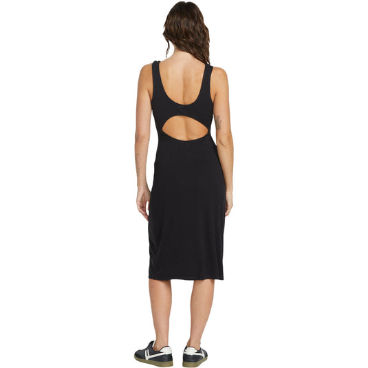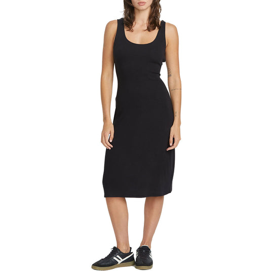 Sporty meets chic in this curve-hugging Volcom Women's Rizzled Midi Dress dress. The flattering viscose/elastane rib blend stretches to flatter while a mesh back panel adds athleisure edge. Throw it on and go - no straps or closures.